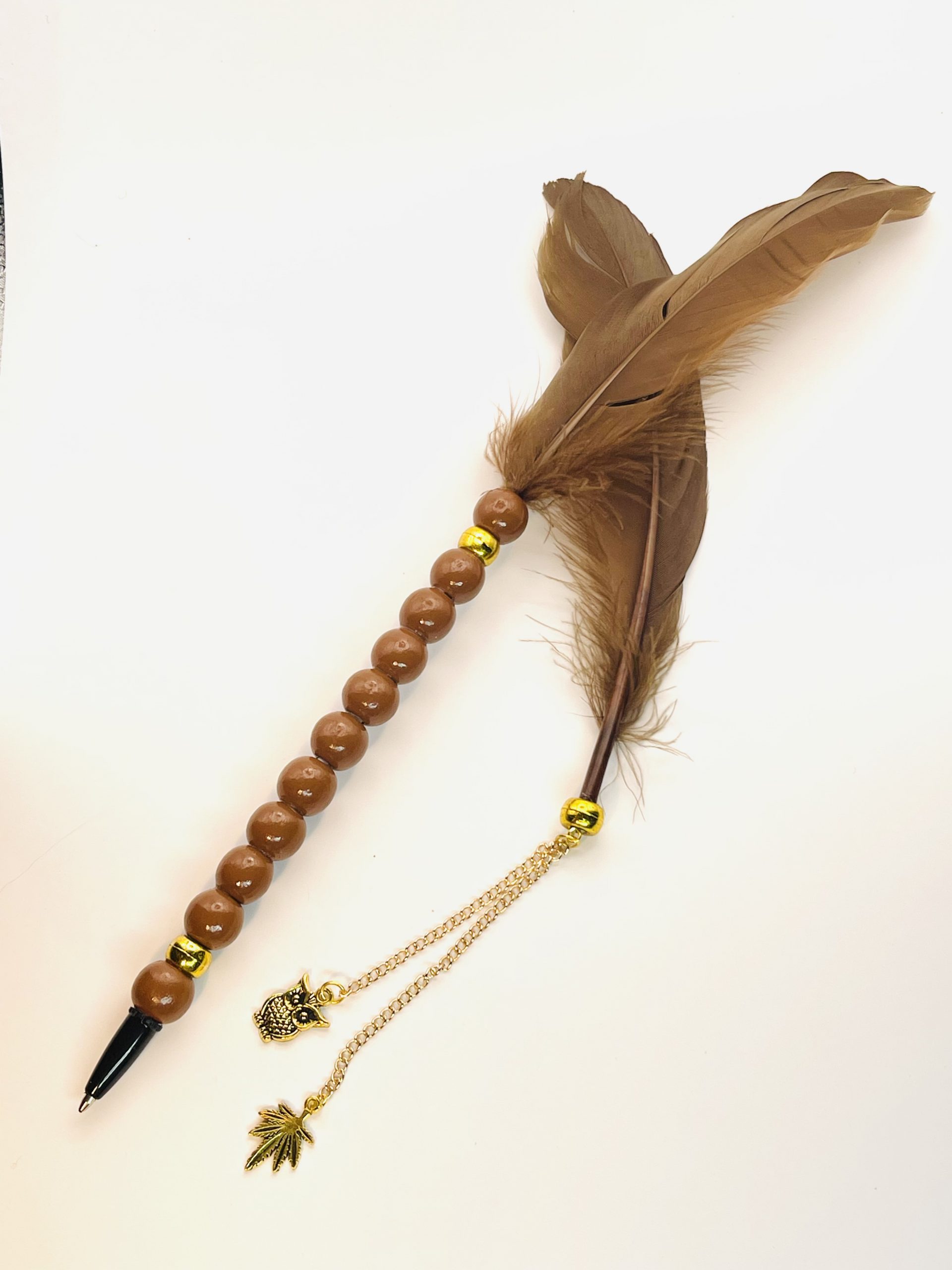 Grounded in warmth. A beaded brown pen with a bold feather and a soft-feather bookmark with wind chime. One of a kind.