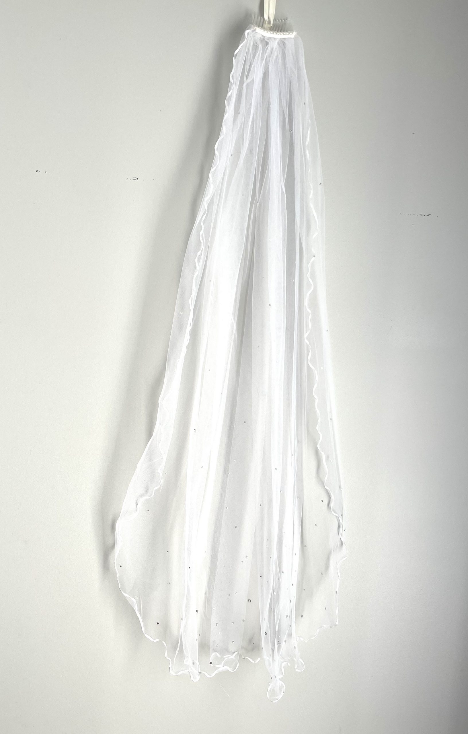 The Ribbonwhirl veil floats with lightness and grace, its bottom edge dancing in gentle curls of ribbon. Made for moments that call for softness and movement, it brings a whisper of romance to any look. Handmade, one of one.