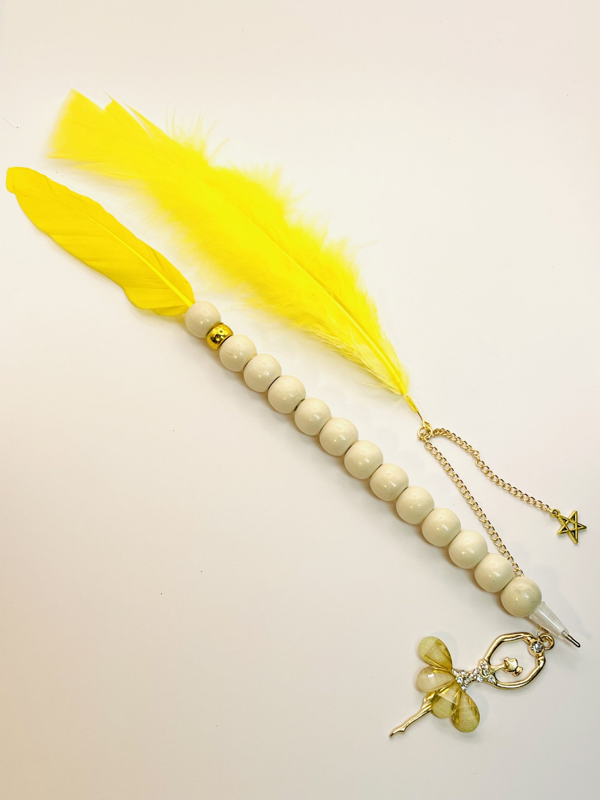 Let sunshine follow your every word with the “Sunbeam” set. The yellow pen sparkles with warm beads and a statement feather topper, while the soft-feather bookmark sings with a light chime. This vibrant set is handmade for joy, ideal as a cheerful gift or desk companion. One of a kind and full of light.